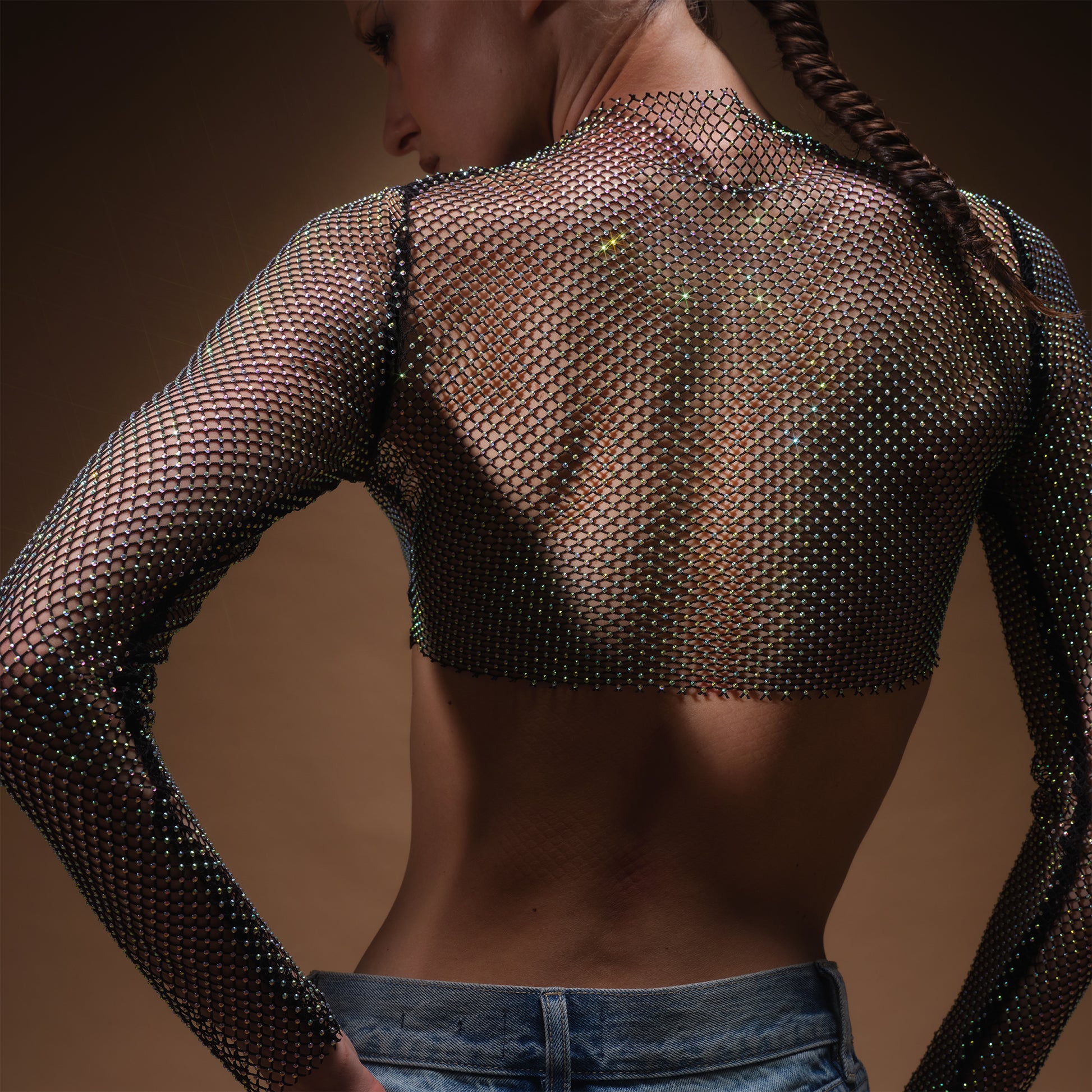 Introducing our Lorelei II rhinestone mesh top, designed to make a bold statement. Crafted from high-quality rhinestone mesh fabric, this top combines comfort with style. The unique design hugs your figure, ensuring you shine brightly in any crowd. It's an essential addition to your wardrobe, perfect for parties or special occasions. Elevate your fashion game and feel fabulous in this eye-catching piece.